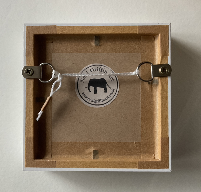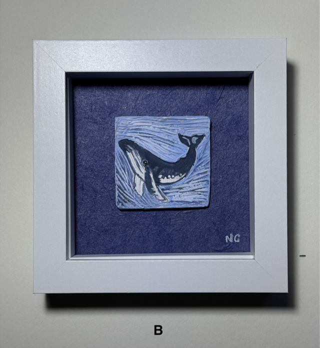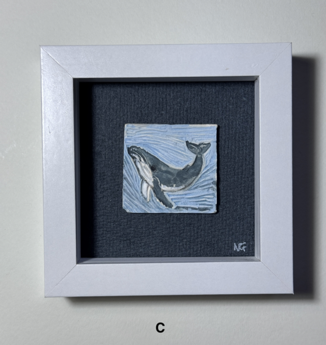 These are ceramic tiles that are framed in small white box frames without glass. Each one is handmade and hand painted so each one is slightly different. Frames measure 12 x 12 cm