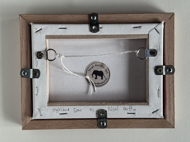 This is an original acrylic painting of a highland cow I photographed many years ago in Scotland on the shores of a loch. It is framed in a solid oak frame which measures 21 x 16 cm