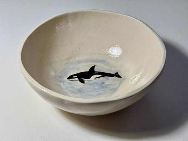 This is an earthenware ceramic bowl with a hand drawn painting of an orca. The bowl measures 6 x 2 inches.